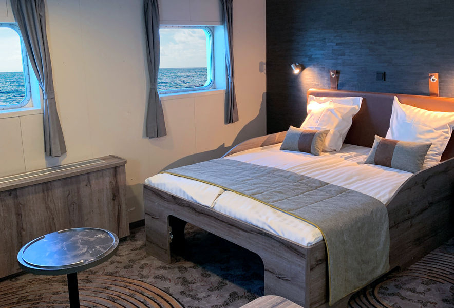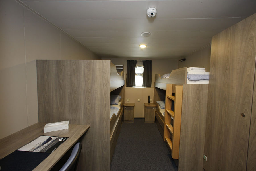 M/V Plancius accommodates 108 passengers in 52 passenger cabins with private toilet and shower in 4 quadruple porthole cabins, 11 twin porthole cabins, 25 twin cabins with window and 2 twin deluxe cabins (ca. 12,5 square meters), and 10 twin superior cabins (ca. 21 square meters). All cabins offer lower berths (one queen-size bed in the superior cabins and two single beds in the twin cabins), except for the 4 quadruple cabins (for 4 persons in 2x upper and lower beds), and 2 triple cabins (1 bunk bed plus 1 lower bed).
