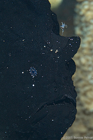 Frogfish from Alor, Indonesia. Photo by Bonnie Pelnar. This frogfish was overexposed and high-pass sharpening was used in photoshop. F13, 1/60th, ISO 200, D300, 105mm lens