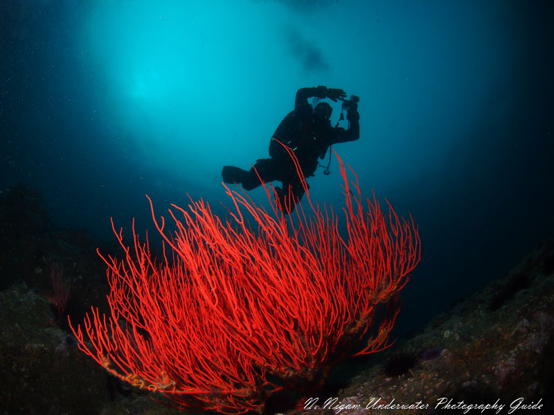 2. Placing a single strobe above the camera and as far behind the camera as possible. As mentioned before, a single strobe is often more than enough light in limited visibility and will make light more even if used correctly. I almost never shoot one strobe from any other position since it can often introduce unwanted contrast.